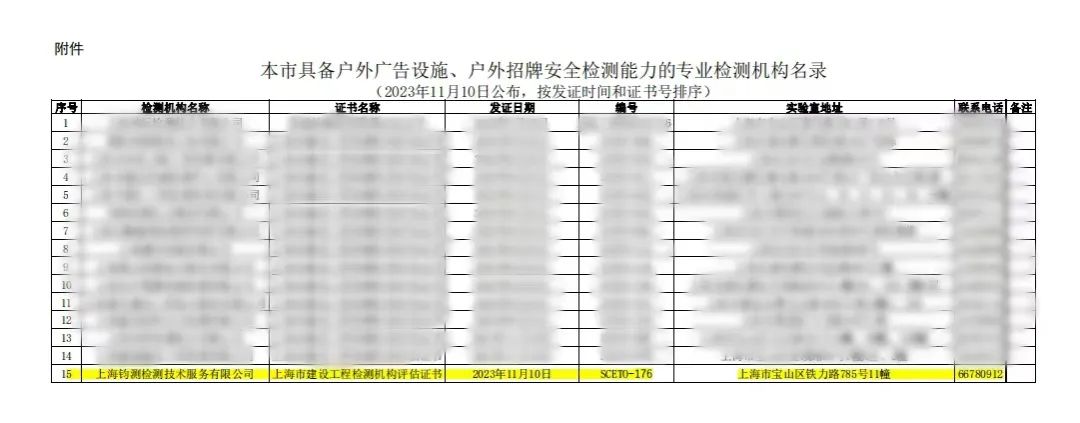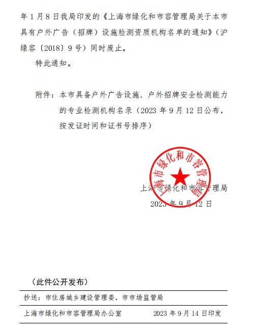 鈞測成功入圍上海市綠化和市容管理局的戶外廣告設施、戶外招牌安全檢測機構(gòu)名單!